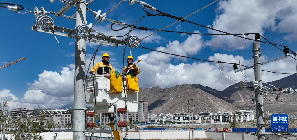 4月26日,扎西尼瑪(右)和徒弟在進(jìn)行高空帶電作業(yè)演練。新華社記者 晉美多吉 攝