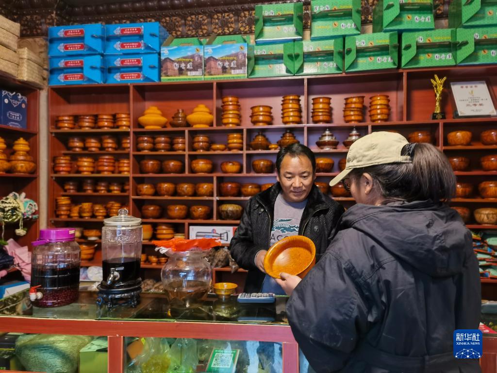 4月24日,游客在山南錯那市麻麻鄉(xiāng)次仁家的民宿中購買木碗。新華社記者 劉洪明 攝