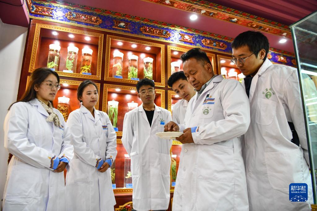 在藏藥材標本室,普窮次仁為學生講解藏藥材知識(4月20日攝)。新華社記者 晉美多吉 攝