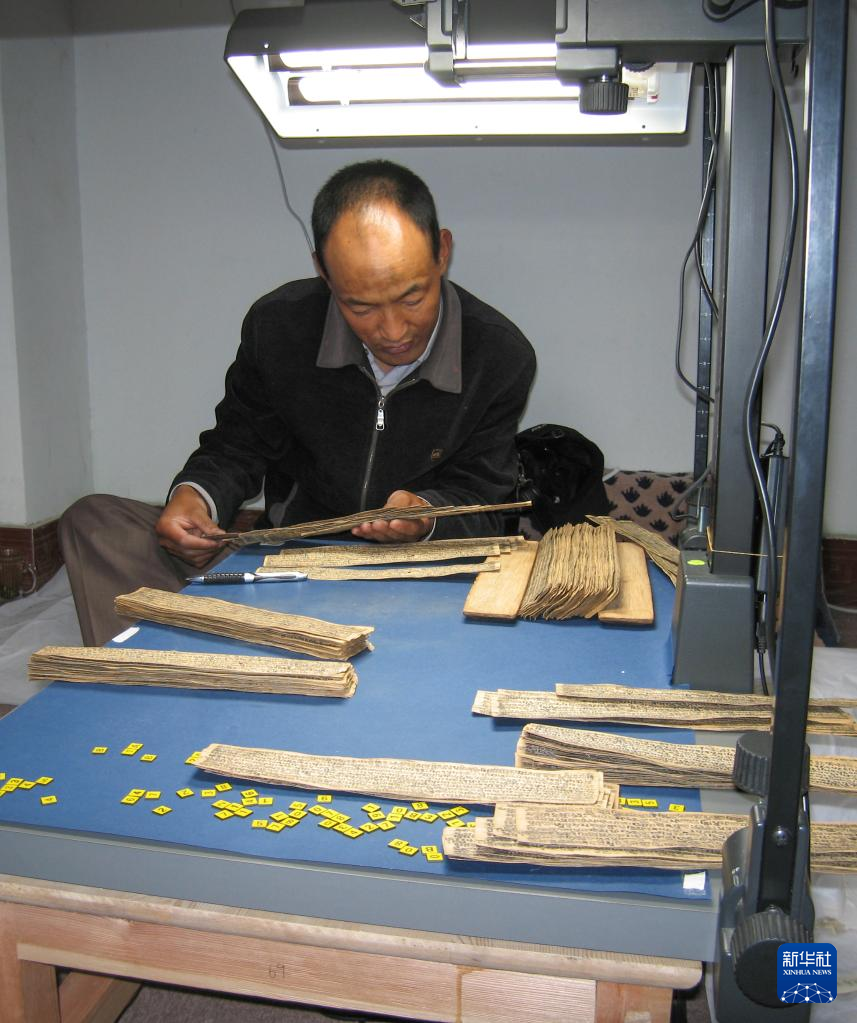 久米次成在西藏自治區(qū)博物館整理影印貝葉經(jīng)(2008年6月26日攝)。