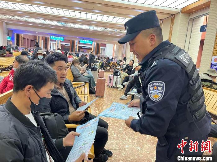 圖為拉薩鐵路公安民警為游客發(fā)放宣傳冊(cè)?!∝暩聛硭伞z