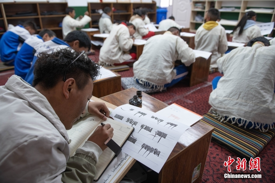 5月7日,西藏山南市,加查縣中學學生和教師在上藏文書法興趣班。該興趣班由2名藏文教師任教,每周兩課時,利用自習課或晚自習時間為學生和教師授課。課程內(nèi)容包含執(zhí)筆、運筆、姿勢等基礎書寫技能,以及藏文中的烏金體、珠擦體、簇仁體、簇通體等各類字體的書寫方法。