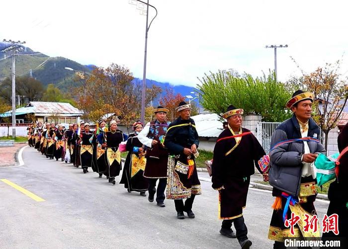 圖為村民背上經(jīng)文繞田。鄧巴 攝