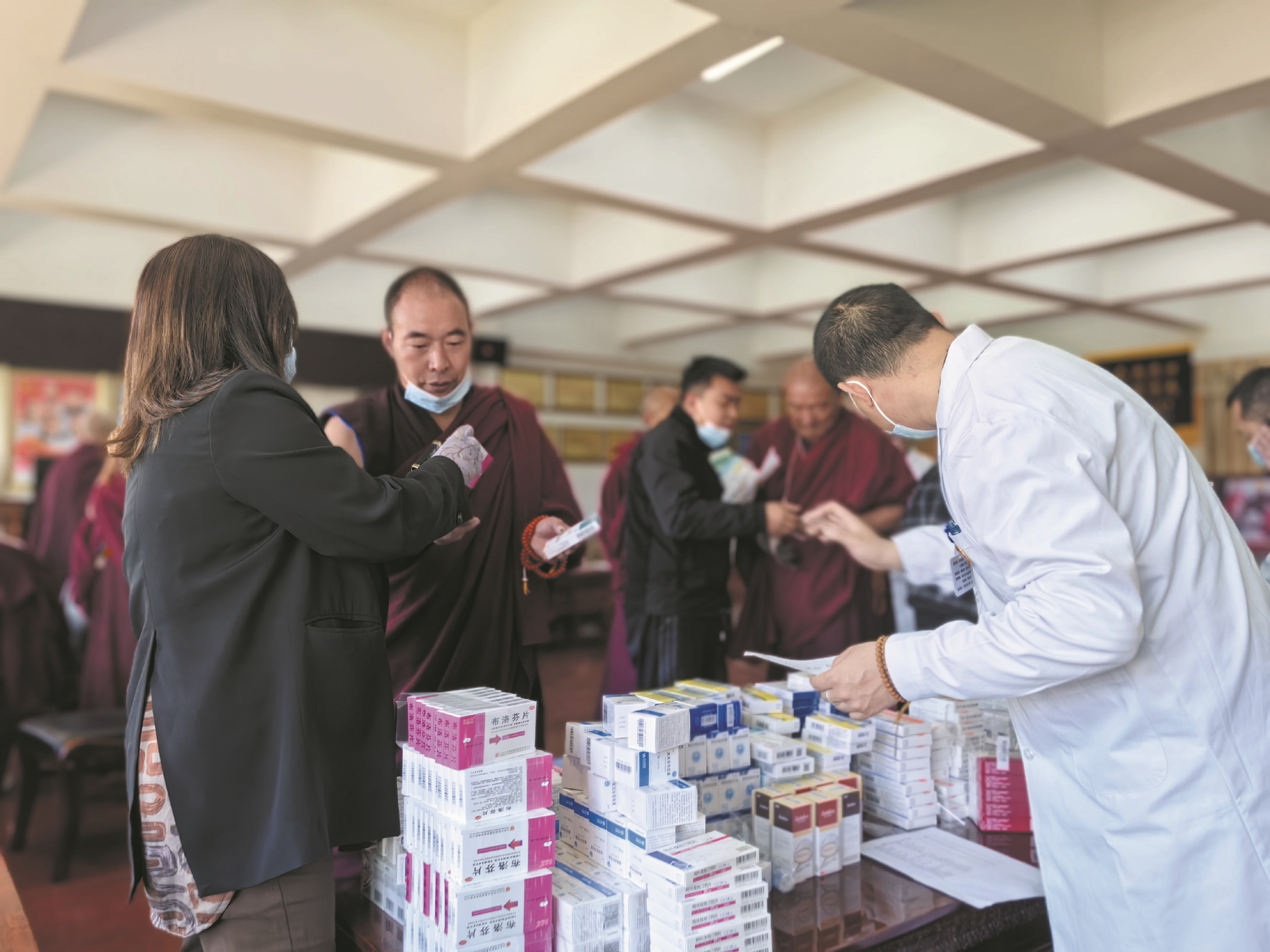 圖為義診現(xiàn)場,北京市第八批援藏醫(yī)療隊(duì)的醫(yī)務(wù)人員熱情接待前來就診和咨詢的僧人,并發(fā)放藥物。 拉薩融媒記者 拉姆次仁攝