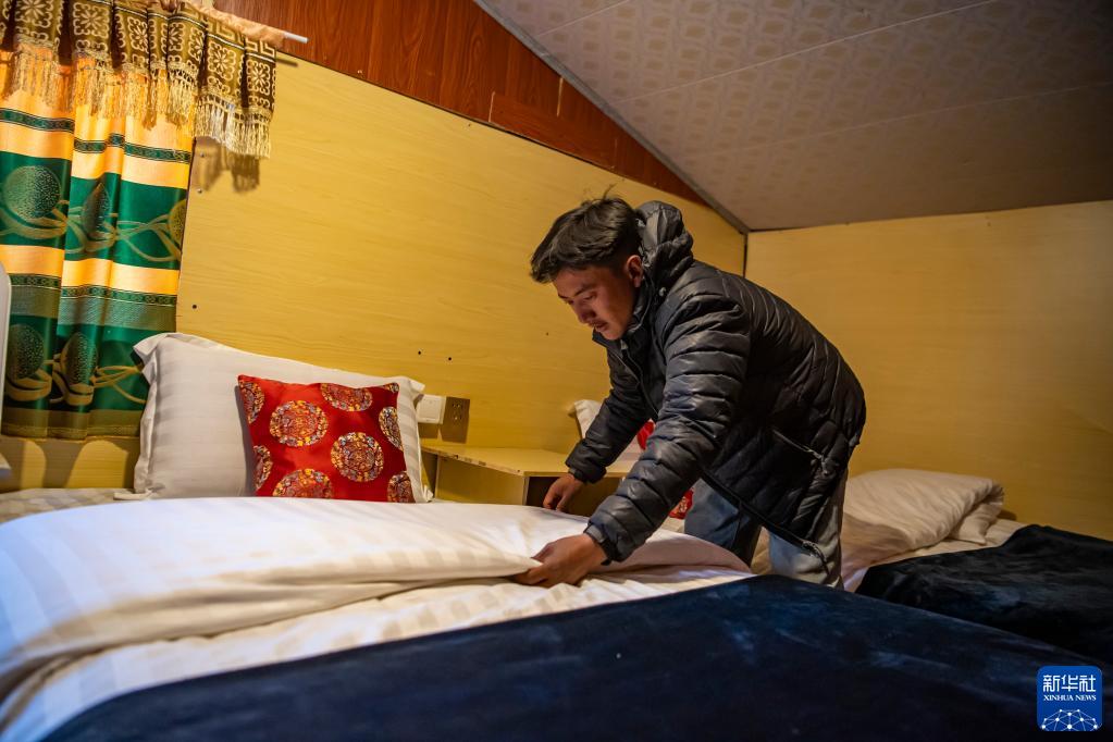 在珠峰游客大本營(yíng)的帳篷旅館,扎西次仁在整理床鋪(5月13日攝)。新華社記者 晉美多吉 攝