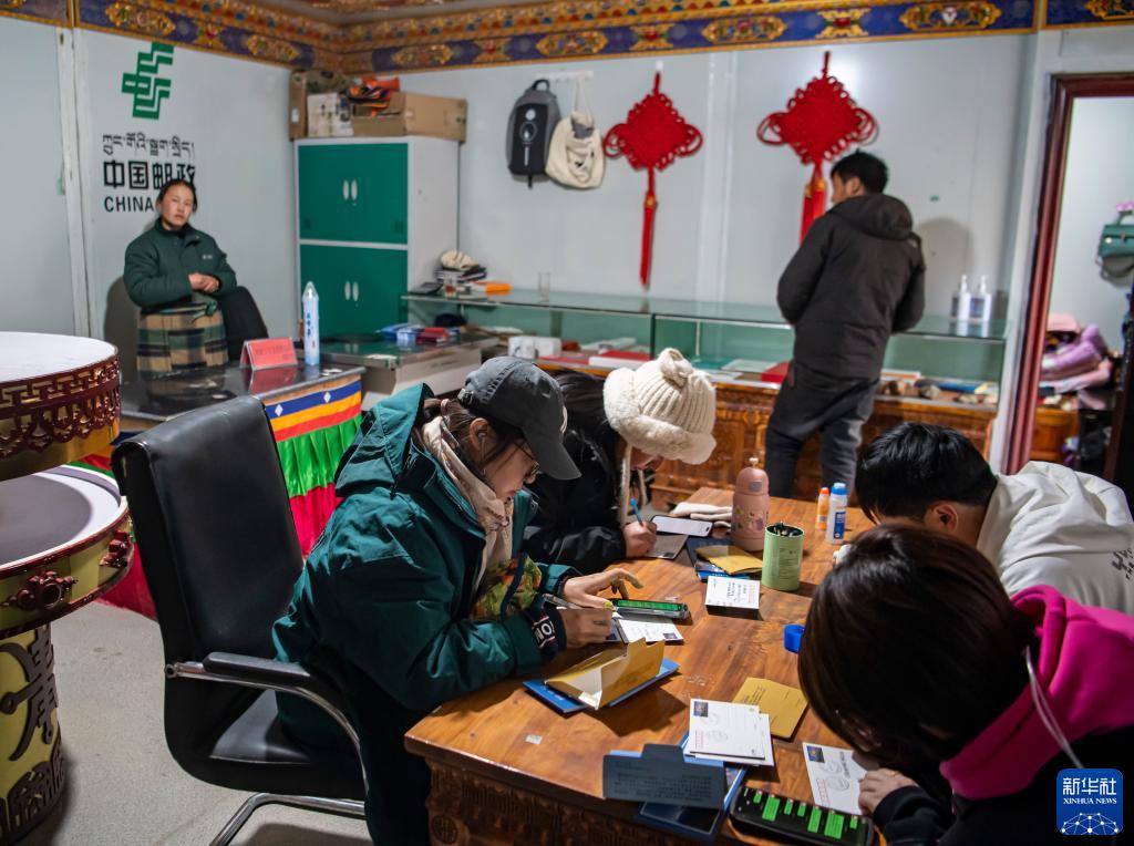 在珠峰游客大本營(yíng)的郵政所,游客在寫明信片(5月13日攝)。新華社記者 孫非 攝
