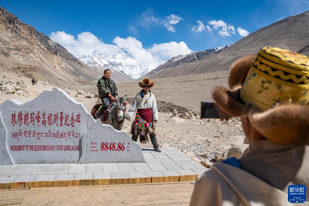 在珠峰大本營(yíng)的珠峰高程測(cè)量紀(jì)念碑前,游客拍照留念(5月20日攝)。新華社記者 孫非 攝