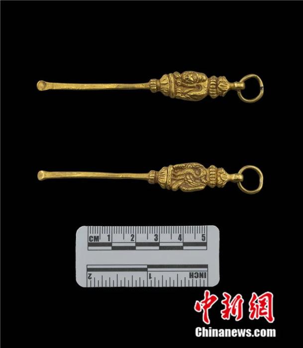 西藏自治區(qū)拉薩市當(dāng)雄縣當(dāng)曲卡鎮(zhèn),當(dāng)雄墓地出土的雄獅鳥紋金耳勺。國家文物局供圖