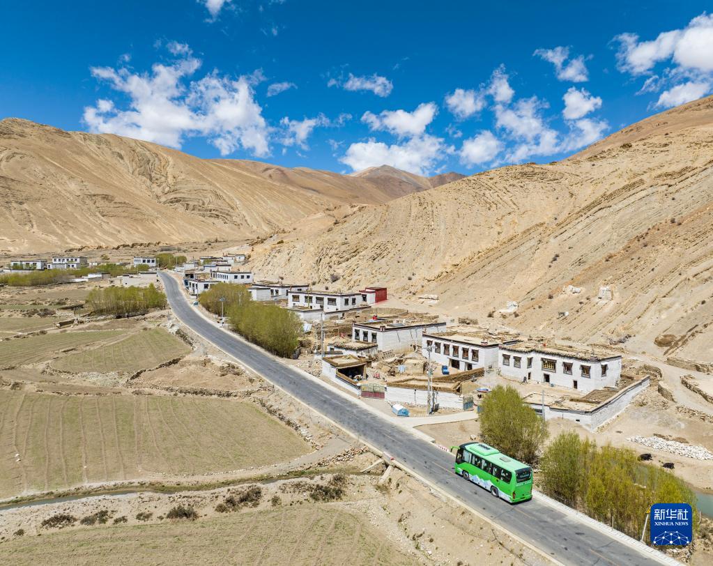 一輛載有游客的環(huán)保大巴車(chē)正駛向珠峰(5月25日攝,無(wú)人機(jī)照片)。新華社記者 孫非 攝