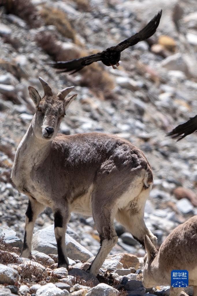 這是在珠峰國(guó)家級(jí)自然保護(hù)區(qū)內(nèi)拍攝的巖羊和黃嘴山鴉(5月13日攝)。新華社發(fā)(旦增努布 攝)