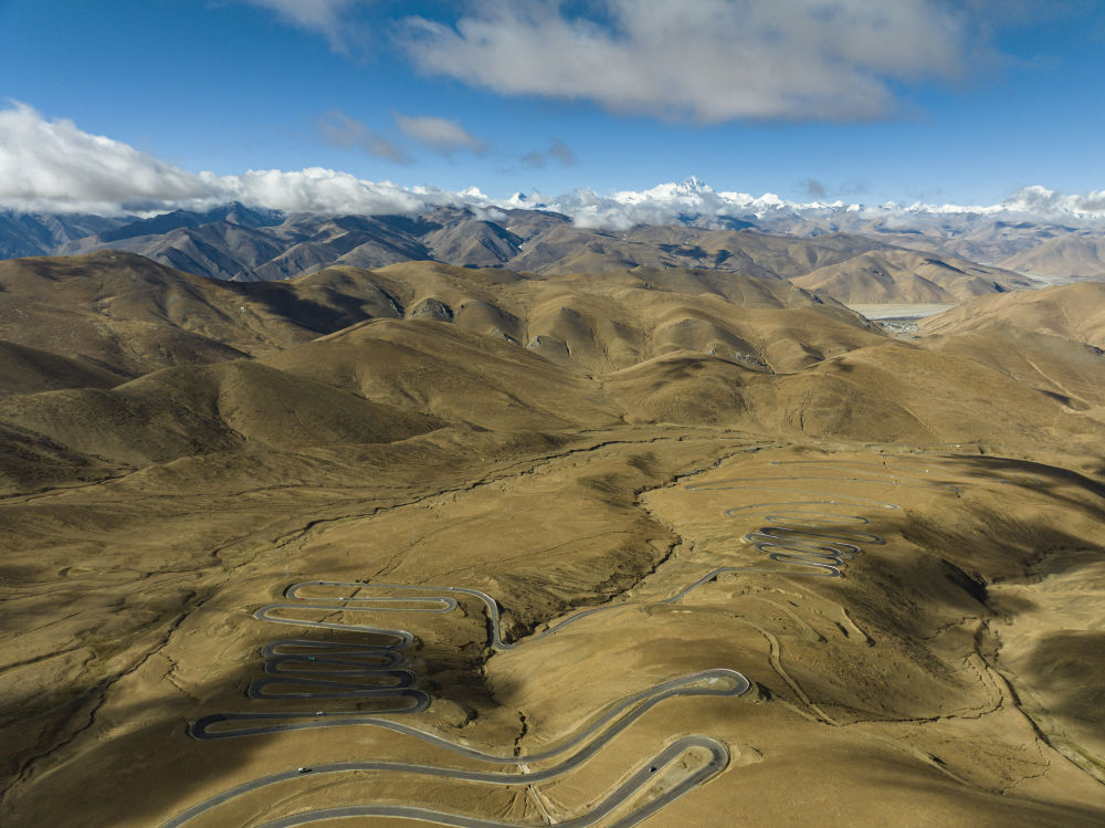 這是在海拔6000米左右高空拍攝的通往珠峰的公路(5月26日攝,無(wú)人機(jī)照片)。新華社發(fā)(旦增努布 攝)
