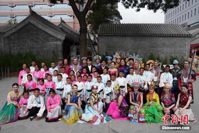 6月1日,來自青海省玉樹藏族自治州兒童福利院的40名藏族青少年參觀中華民族共同體體驗館。圖為孩子們與參加演出的多民族藝術家們合影。中新社記者 崔楠 攝