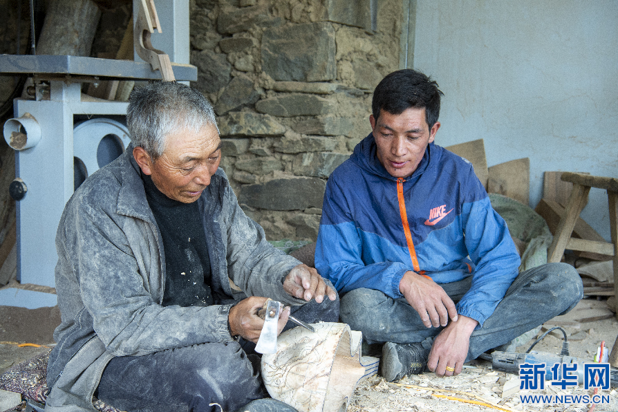 6月8日,娘嘎扎念琴制作技藝傳承人羅布次旦給兒子指導(dǎo)制作技藝。新華網(wǎng) 旦增努布 攝