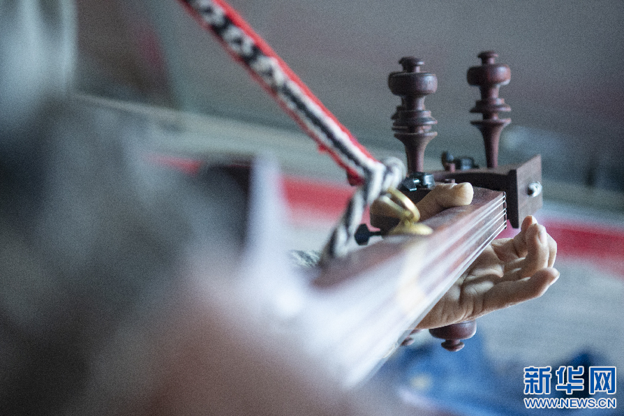 6月8日,娘嘎扎念琴制作技藝傳承人羅布次旦在彈奏扎念琴。新華網(wǎng) 旦增努布 攝