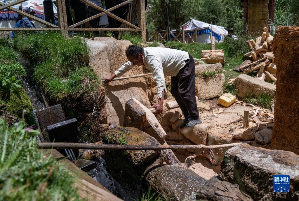 在西藏尼木縣吞巴鎮(zhèn)吞達(dá)村,次仁多吉在啟動(dòng)水磨,將作為原料的柏木碾成木漿(6月9日攝)。新華社記者 孫非 攝