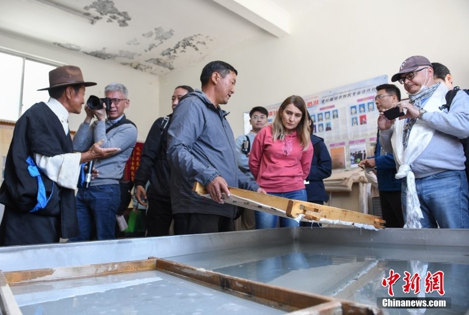 6月15日,西藏拉薩,記者們?cè)谀崮究h非遺工坊(藏紙制作廠)采訪了解藏紙。在第五屆中國西藏旅游文化國際博覽會(huì)召開之際,國務(wù)院新聞辦組織中外媒體記者赴西藏采訪,路透社、共同社、西班牙埃菲社、意大利安莎社、新加坡《聯(lián)合早報(bào)》和中央廣電總臺(tái)、中國日?qǐng)?bào)等15家媒體的20名記者參加。6月15日,采訪團(tuán)一行前往拉薩市尼木縣參訪體驗(yàn)西藏傳統(tǒng)藏香、藏紙文化。