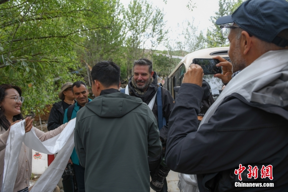 6月15日,西藏拉薩,尼木縣吞巴鎮(zhèn)吞達(dá)村村民給來訪記者們敬獻(xiàn)哈達(dá),表示歡迎。在第五屆中國西藏旅游文化國際博覽會(huì)召開之際,國務(wù)院新聞辦組織中外媒體記者赴西藏采訪,路透社、共同社、西班牙埃菲社、意大利安莎社、新加坡《聯(lián)合早報(bào)》和中央廣電總臺(tái)、中國日?qǐng)?bào)等15家媒體的20名記者參加。6月15日,采訪團(tuán)一行前往拉薩市尼木縣參訪體驗(yàn)西藏傳統(tǒng)藏香、藏紙文化。