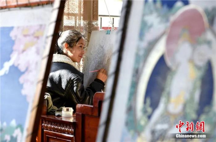 索朗次旺在西藏拉薩繪制唐卡。隨著社會(huì)的發(fā)展,越來越多的西藏女性學(xué)習(xí)唐卡繪畫。李林 攝