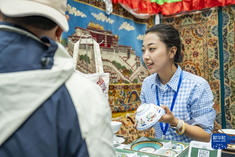 在第五屆“藏博會”現(xiàn)場,工作人員向顧客介紹產(chǎn)品(6月18日攝)。新華社記者 孫非 攝