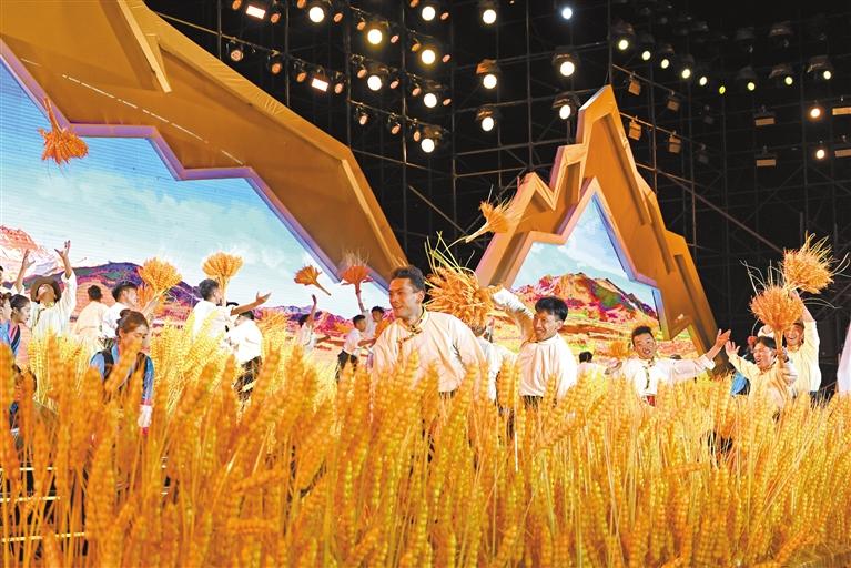 聲,是情的流露;舞,是意的表達(dá)。開幕式文藝表演由序《珠峰頌歌》、上篇《戀上青稞》、下篇《極境暢想》和尾聲《吉祥日喀則》組成。序《珠峰頌歌》中,150名演員深情合唱歌曲《珠穆朗瑪》,表演節(jié)奏歡快的男女踢踏舞等,展現(xiàn)日喀則高質(zhì)量發(fā)展的加速度和拼搏奮進(jìn)的精氣神。上篇《戀上青稞》,展示日喀則各族群眾勤勞、樂觀、向上的精神風(fēng)貌和獨(dú)具魅力的地域文化。下篇《極境暢想》,以青稞美酒作為表現(xiàn)載體,以游客的視角介紹日喀則文旅資源,并通過藏戲和昆曲等多種文化藝術(shù)碰撞,展示日喀則在打造面向南亞大通道的發(fā)展機(jī)遇中,廣泛開展對(duì)外開放交流合作。尾聲《吉祥日喀則》,展示日喀則海納百川、開放包容的胸襟和熱情。