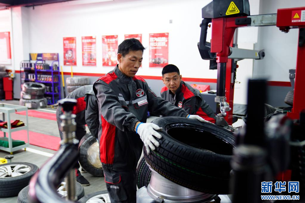 這是員工正在為首位顧客的汽車更換輪胎。新華社記者劉洪明 攝