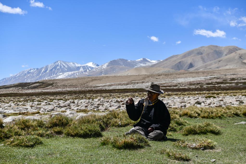 洛桑占堆在“三代房”前的草地上回憶當(dāng)年的場(chǎng)景(5月28日攝)。新華社記者 晉美多吉 攝