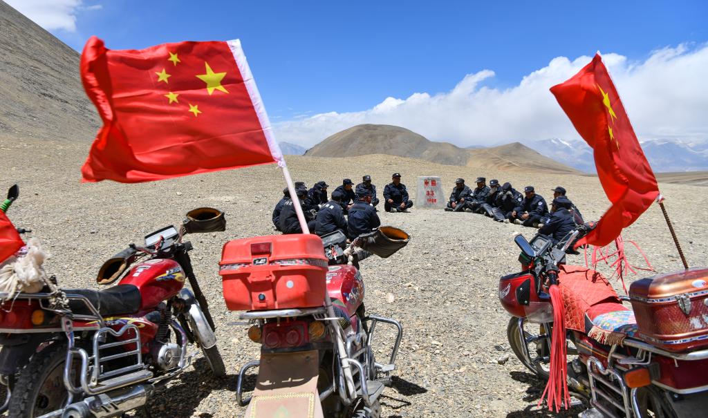 在33號(hào)界碑處,護(hù)邊隊(duì)在隊(duì)長(zhǎng)的帶領(lǐng)下開展學(xué)習(xí)(6月2日攝)。新華社記者 晉美多吉 攝