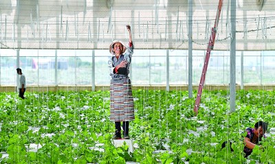 工作人員在山南市扎囊縣阿扎鄉(xiāng)的玻璃溫室里養(yǎng)護(hù)旗云瓜。湖南省第九批援藏工作隊(duì)引進(jìn)智慧農(nóng)業(yè)和戈壁田園植物工廠項(xiàng)目,在荒地建起有機(jī)果蔬基地200多畝。攝影:辜鵬博(湖南日報(bào)攝影記者)