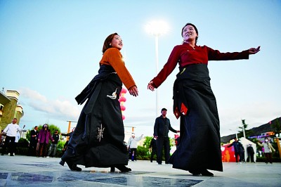 市民在湖南援建的山南市體育館廣場上跳鍋莊舞。攝影:辜鵬博(湖南日報(bào)攝影記者)