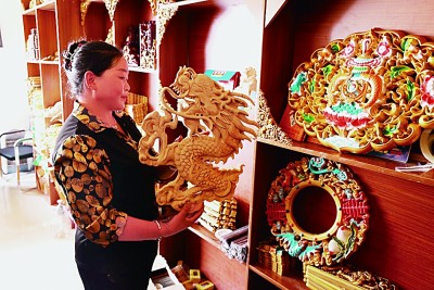 藏式木雕作為一種民間藝術(shù)形式,在西藏各地廣泛流行。圖為芒康縣一家工藝品店內(nèi),店主在擺放藏式木雕手工藝品。光明日報記者 劉宇航攝
