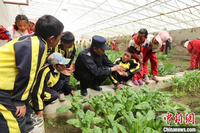 圖為民警為巴嘎鄉(xiāng)小學(xué)生科普溫室大棚種植技術(shù)。西藏出入境邊防檢查總站阿里邊境管理支隊(duì)供圖
