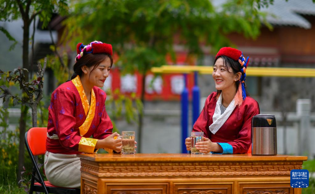 錯(cuò)那市貢日門巴民族鄉(xiāng)斯木村第一書記尼瑪卓瑪(右一)在與村民一起品嘗莓茶(7月28日攝)。新華社記者 姜帆 攝
