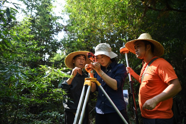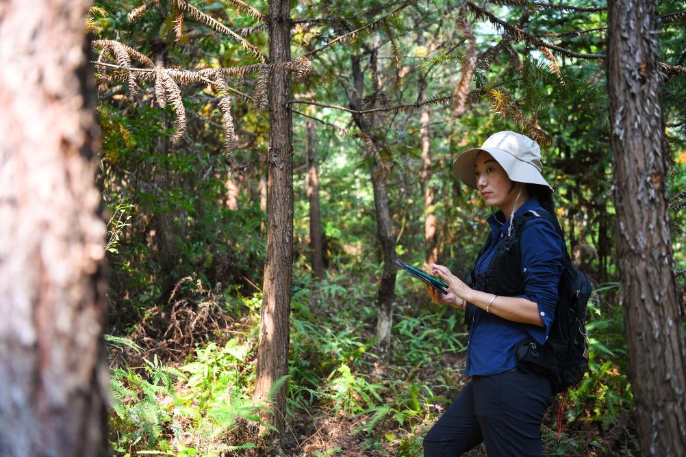 2022年9月22日,白拉曲珍在廣東韶關(guān)樂昌市張溪村生態(tài)監(jiān)測樣地工作。新華社記者鄧華 攝