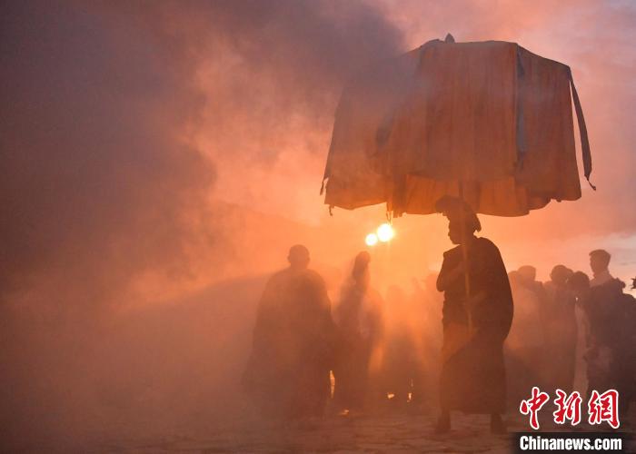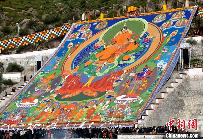 8月16日,拉薩哲蚌寺舉行展佛活動。中新社記者 李林 攝