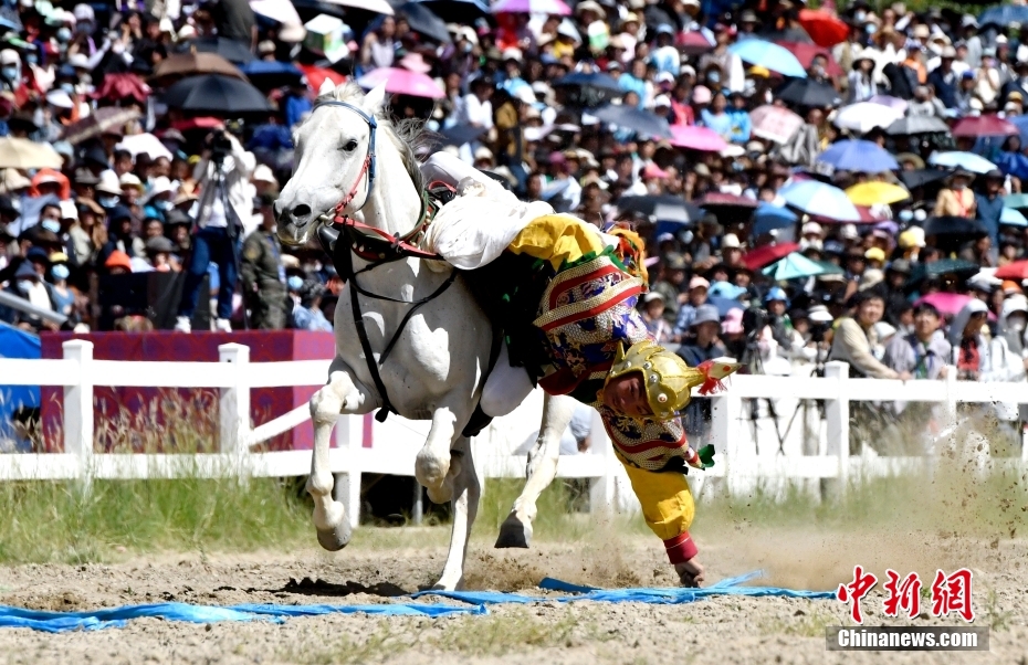 8月17日,騎手們進(jìn)行馬術(shù)表演。當(dāng)日,2023年拉薩雪頓節(jié)民族傳統(tǒng)馬術(shù)表演在西藏拉薩市北郊賽馬場(chǎng)舉行。