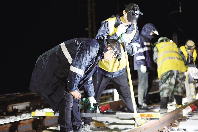 21時(shí)30分,作業(yè)中,暴雨傾盆而下,瞬間覆蓋了整個(gè)施工現(xiàn)場(chǎng),噼里啪啦地打在現(xiàn)場(chǎng)作業(yè)人員身上。早已經(jīng)歷過無數(shù)次風(fēng)雨洗禮的他們,握緊手中的工具,按照分工忙碌起來,有的測(cè)量數(shù)據(jù)、有的配合作業(yè)、有的檢查設(shè)備、有的盯控安全……整個(gè)作業(yè)現(xiàn)場(chǎng)忙而有序,這場(chǎng)突降的暴風(fēng)雨,儼然已成為促使他們奮進(jìn)的鼓點(diǎn),他們正用昂揚(yáng)的斗志,奏響高原鐵路人的“天路夜曲”。