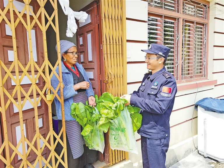 立新邊境派出所民警文昌太給轄區(qū)孤寡老人送去自己種的蔬菜?!D片由日喀則邊境管理支隊提供