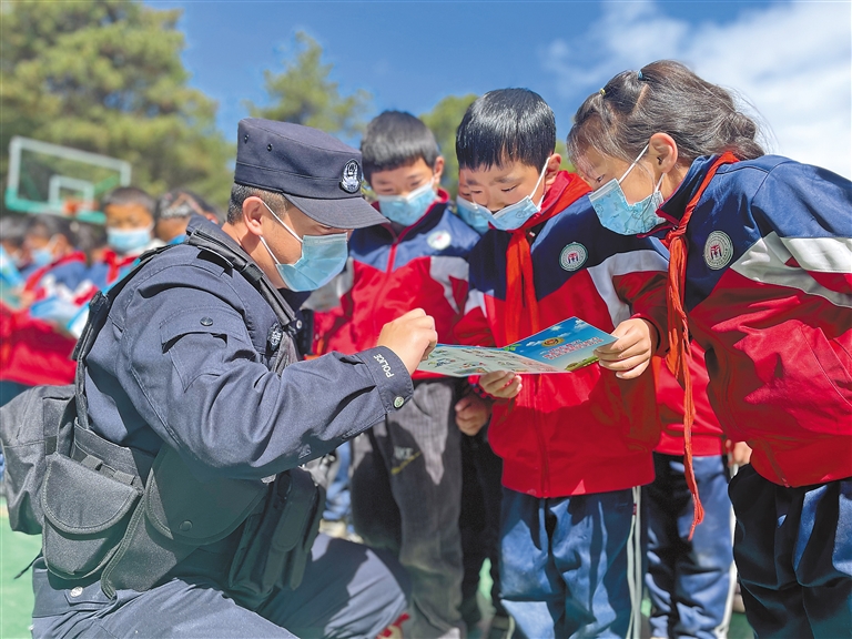 林芝邊境管理支隊南伊邊境派出所副所長趙軍為小學(xué)生開展安全宣傳,講解民族團結(jié)相關(guān)政策。記者 張猛 攝