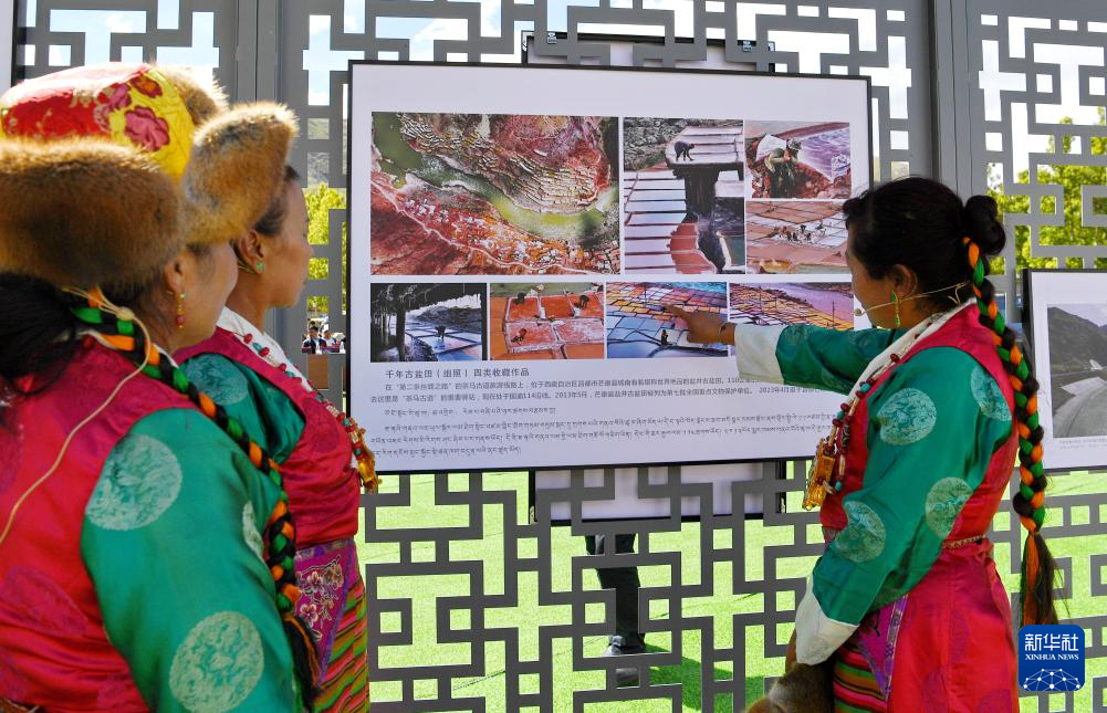 在拉薩市林周縣邊交林鄉(xiāng)當(dāng)杰村,人們在欣賞第十六屆西藏珠穆朗瑪攝影大展作品(9月8日攝)。新華社記者 張汝鋒 攝