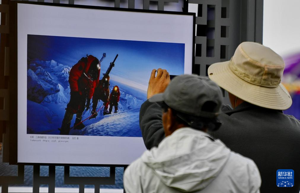 在拉薩市林周縣邊交林鄉(xiāng)當(dāng)杰村,人們在欣賞第十六屆西藏珠穆朗瑪攝影大展作品(9月8日攝)。新華社記者 張汝鋒 攝?
