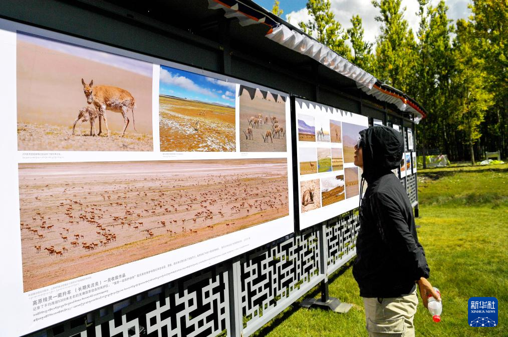 在拉薩市林周縣邊交林鄉(xiāng)當(dāng)杰村,觀眾在欣賞第十六屆西藏珠穆朗瑪攝影大展作品(9月8日攝)。新華社記者 張汝鋒 攝
