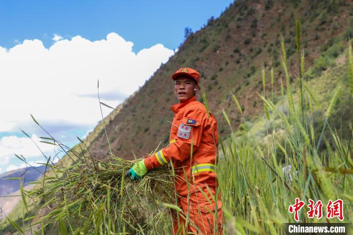 圖為消防員收割后搬運青稞。劉星文 攝