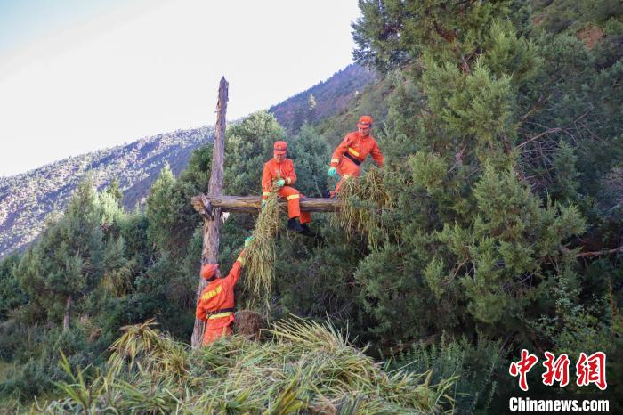 消防員將農牧民的青稞掛到架子上晾曬,這是當?shù)氐膫鹘y(tǒng)青稞晾曬方式。劉星文 攝