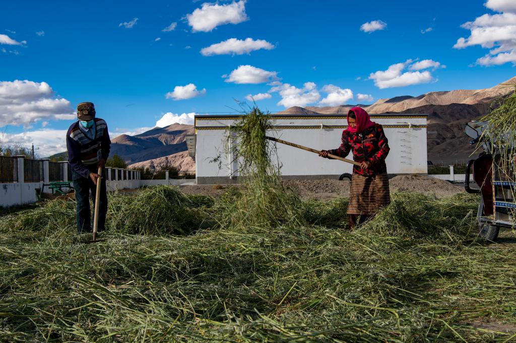 阿里地區(qū)噶爾縣昆莎鄉(xiāng)噶爾新村村民在場院晾曬紫花苜蓿(9月20日攝)。新華社記者 姜帆 攝