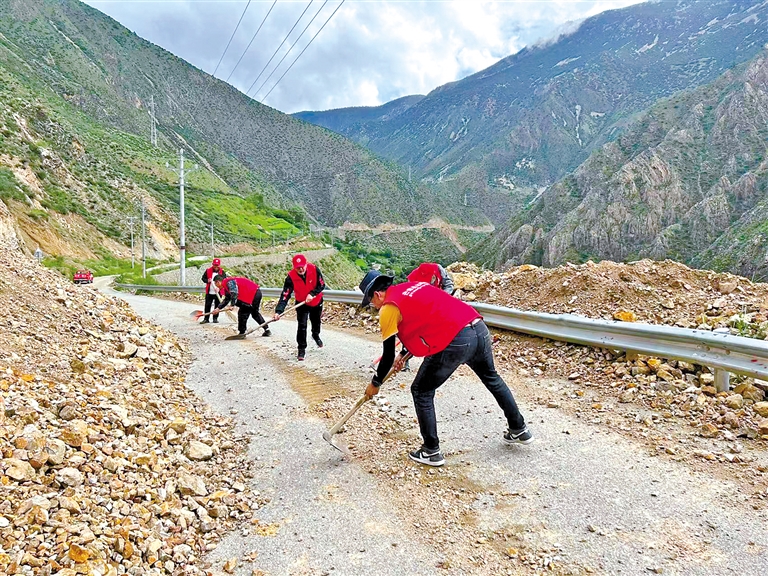 圖為芒康縣曲登鄉(xiāng)黨員開展志愿服務(wù)活動(dòng),清理阻塞道路的落石。