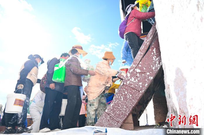 參與到粉刷中的民眾有序運送或潑灑涂料。快70歲的丹巴渾身沾滿了白色涂料,小憩間盤腿席地而坐,正在喝甜茶的他,還不忘熱情招呼記者品嘗。這位老人原是布達拉宮的木匠,工作了28年。退休后,每年布達拉宮粉刷,他幾乎都要來參加,覺得來布達拉宮像回家一樣親切。他說:“以前都是口頭通知喊大家過來,現(xiàn)在網(wǎng)上一發(fā)消息,大家都主動參加?!?/p>