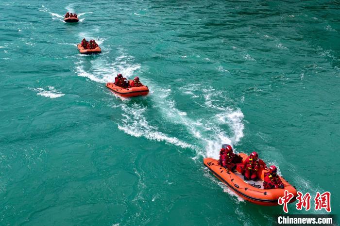 圖為林芝森林消防指戰(zhàn)員進(jìn)行舟艇一字型前進(jìn)編隊(duì)訓(xùn)練。楊永龍 攝