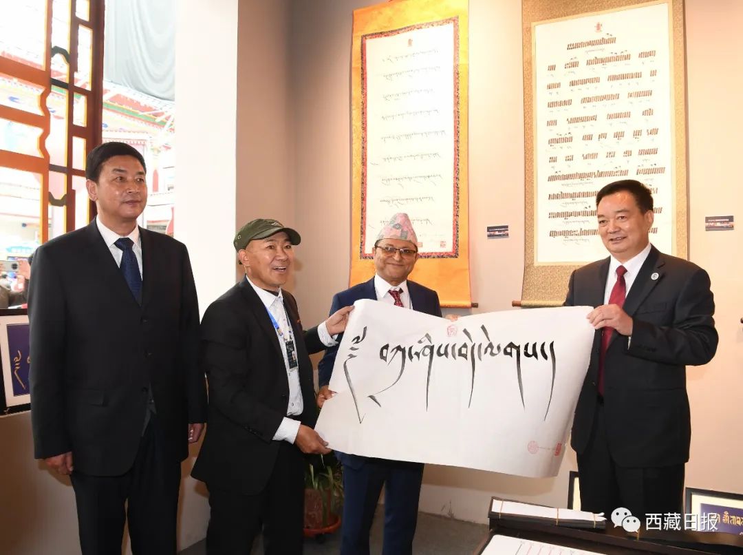這是中國西藏旅游文化國際博覽會期間,王君正向尼泊爾聯(lián)邦院主席加內(nèi)什·普拉薩德·蒂米爾西納贈送藏文書法作品。記者 李洲 攝