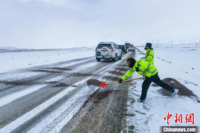 圖為西藏安多交警在唐古拉山段潑灑防滑沙。安多縣公安局 供圖