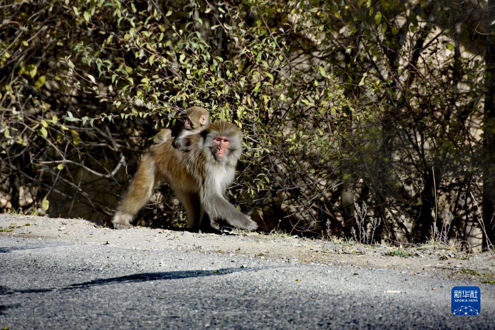 一只藏獼猴背著小猴子在公路旁行走(10月25日攝)。新華社記者 劉文博 攝